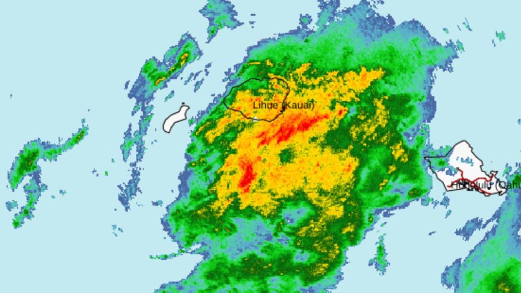 Radar indicated at 5:20 a.m. the showers — associated with a powerful kona low affecting the state — will likely continue to overspread the Garden Isle for at least the next couple of hours.