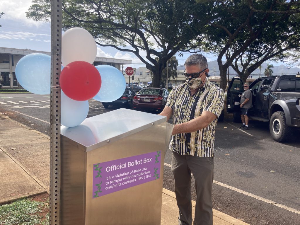 As Erin Olsen slipped her ballot into a dropbox near the Historic County Annex Building in Lihu‘e on the morning of Election Day, she said: “I’m so grateful to be able to take advantage of the right to vote.”