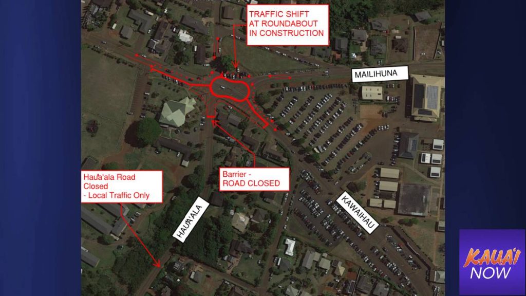 The intersection of Mailihuna Road, Hau‘a‘ala Road and Kawaihau Road will experience temporary traffic shifts and temporary traffic control plans will be in place as construction of the new roundabout continues. No road work will occur during the peak traffic times for school drop-off and pick up. Please note that there will be intermittent 1-lane closures during the week to allow for road reconstruction at the roundabout.