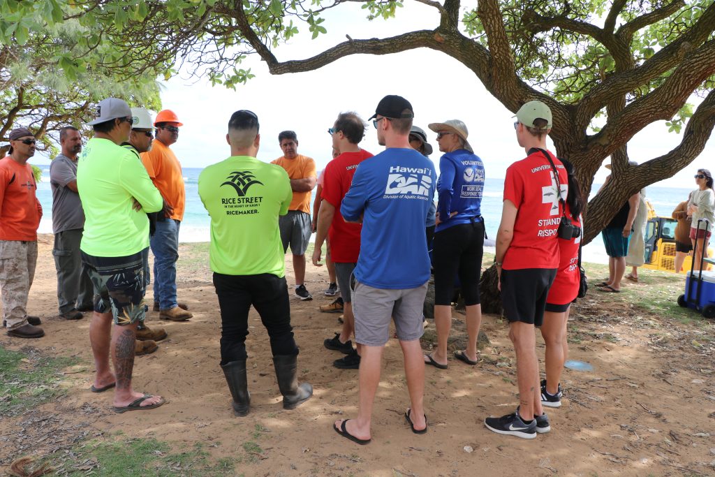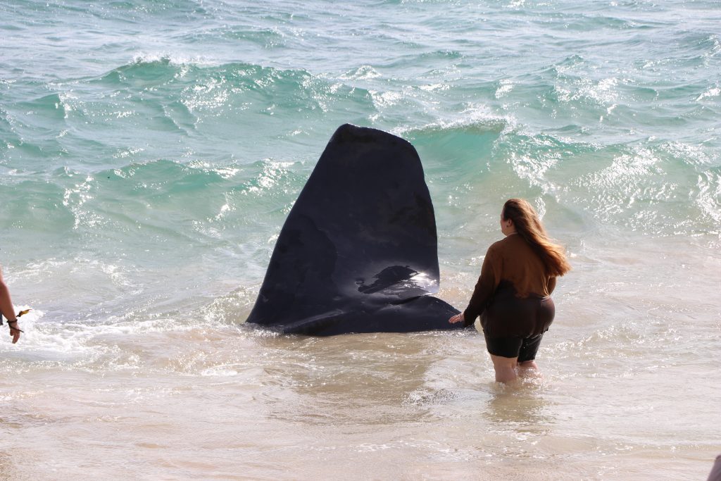 Native Hawaiian practitioners have been conducting cultural protocols as heavy equipment is attempting to move the 56-foot, 60-ton carcass onto the beach. Spectators are being kept back and are asked not to cross the yellow tape during the continuing operation.