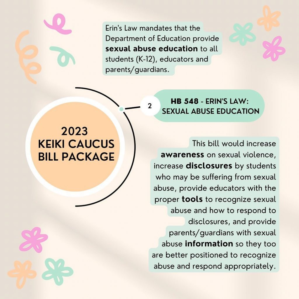- House Bill 548, which would create the Erin’s Law Task Force to review policies, programs and curricula for educating public school students about sexual abuse and sex trafficking prevention, culminating in a systemwide sexual abuse prevention education program.