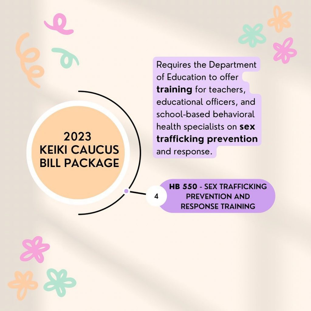 - House Bill 550, which would require the Hawai’i Department of Education to offer training for teachers, educational officers and school-based behavioral health specialists on sex trafficking prevention and response. The bill was introduced by Big Island state Rep. Jeanné Kapela.