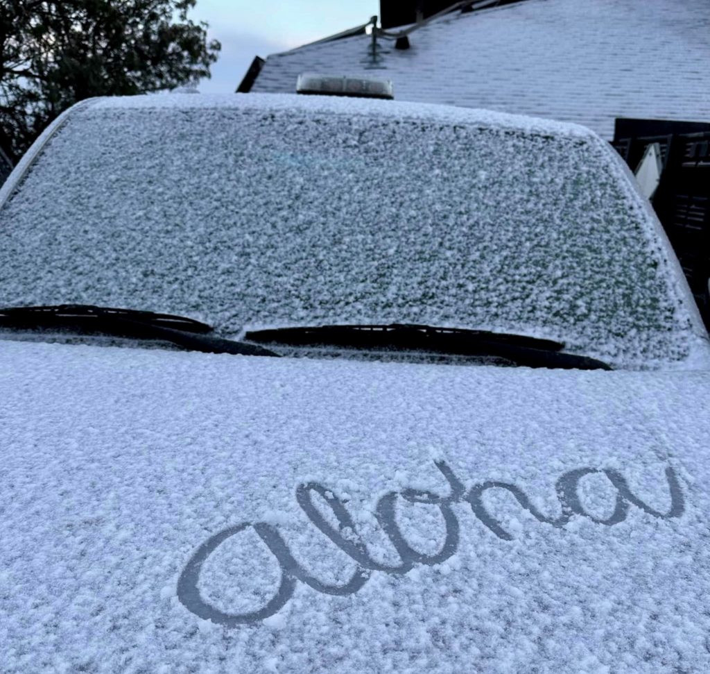 Keith Kefford, who works at the Visitor Information Station, posted pictures of the snow in the Hawai‘i Tracker group on Facebook, one of which showed a message of “aloha” written in the fresh dusting on top of a vehicle’s hood.