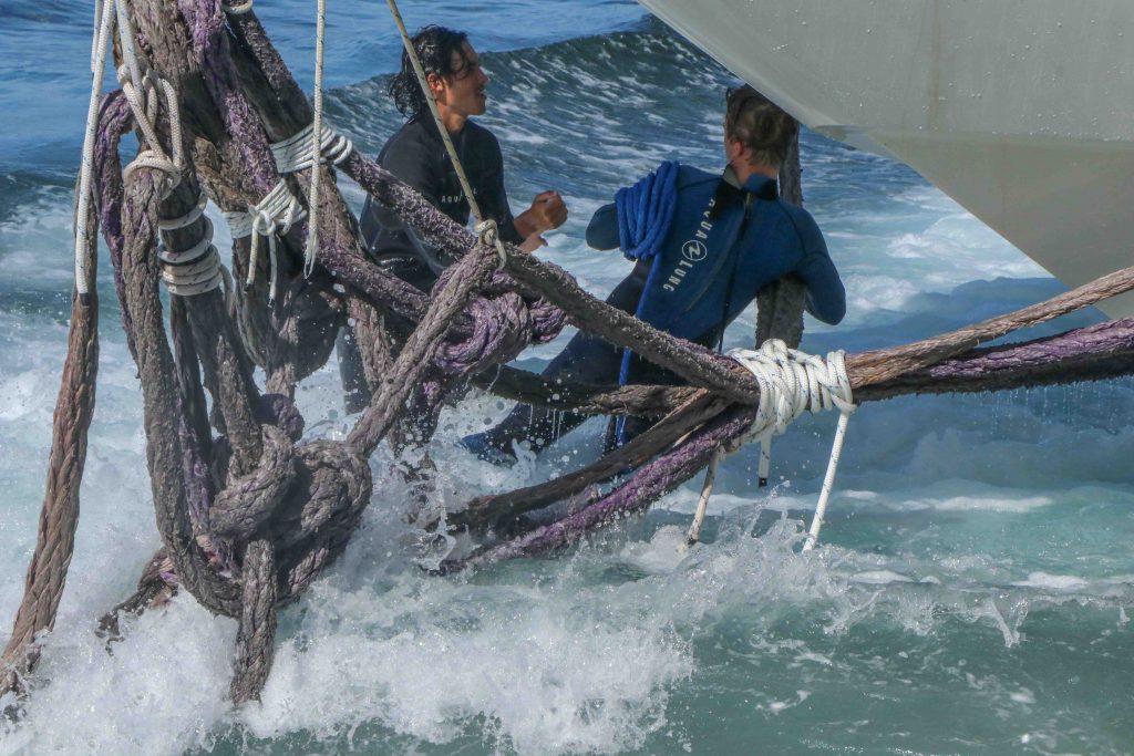 • Crews spent all day Saturday and part of Sunday rigging lines around the yacht Nakoa in preparation for a third attempt of being pulled from the nearshore reef on Maui. Photo: Department of Land and Natural Resources