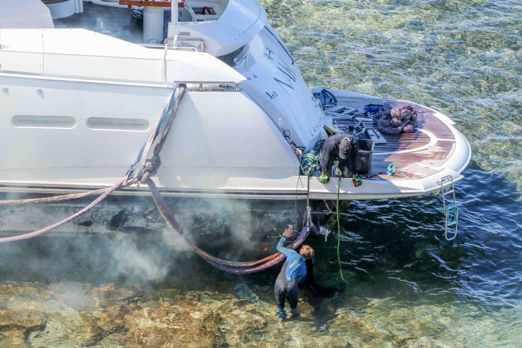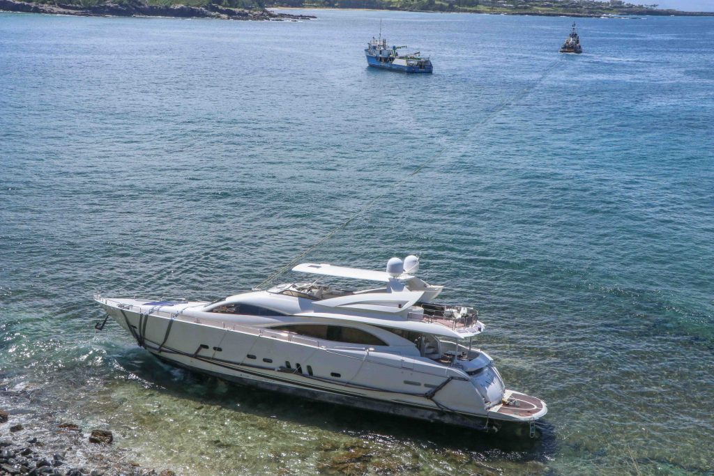 Prior to the 3,300-horsepower tug hooking up, the salvage crew used a carbon cutter to free either the yacht’s prop or rudder, believed to be the reason earlier attempts did not succeed, according to the Department of Land and Natural Resources.
