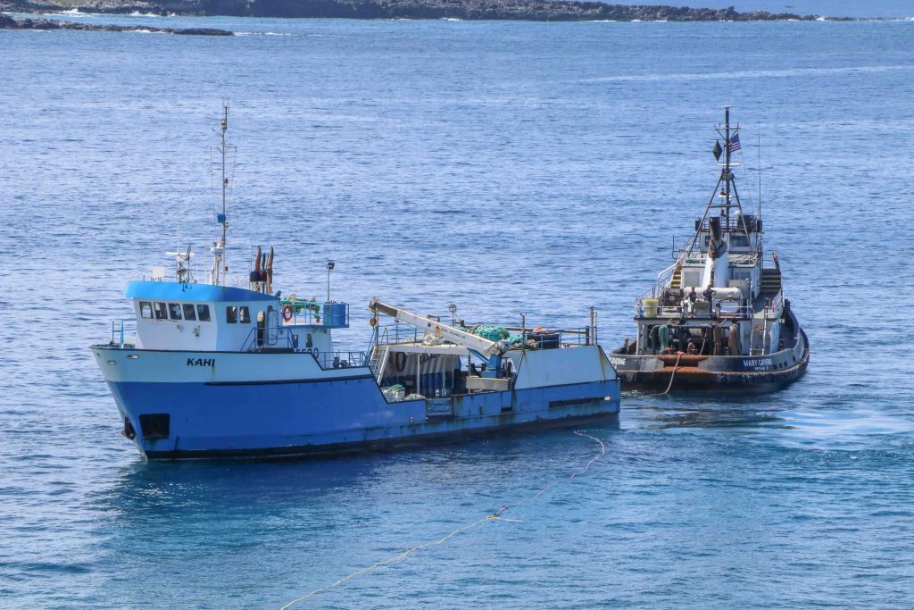 Once the hazardous material was removed, Visonary Marines’s salvage ship Kahi from Honolulu tried to removed the yacht from the reef but failed after multiple pulls. Sause Brothers’ tractor tug Mary Catherine was called in from Honolulu to help, but the second attempt with both boats also failed. Then bad weather forced both salvage boats to return to Honolulu.