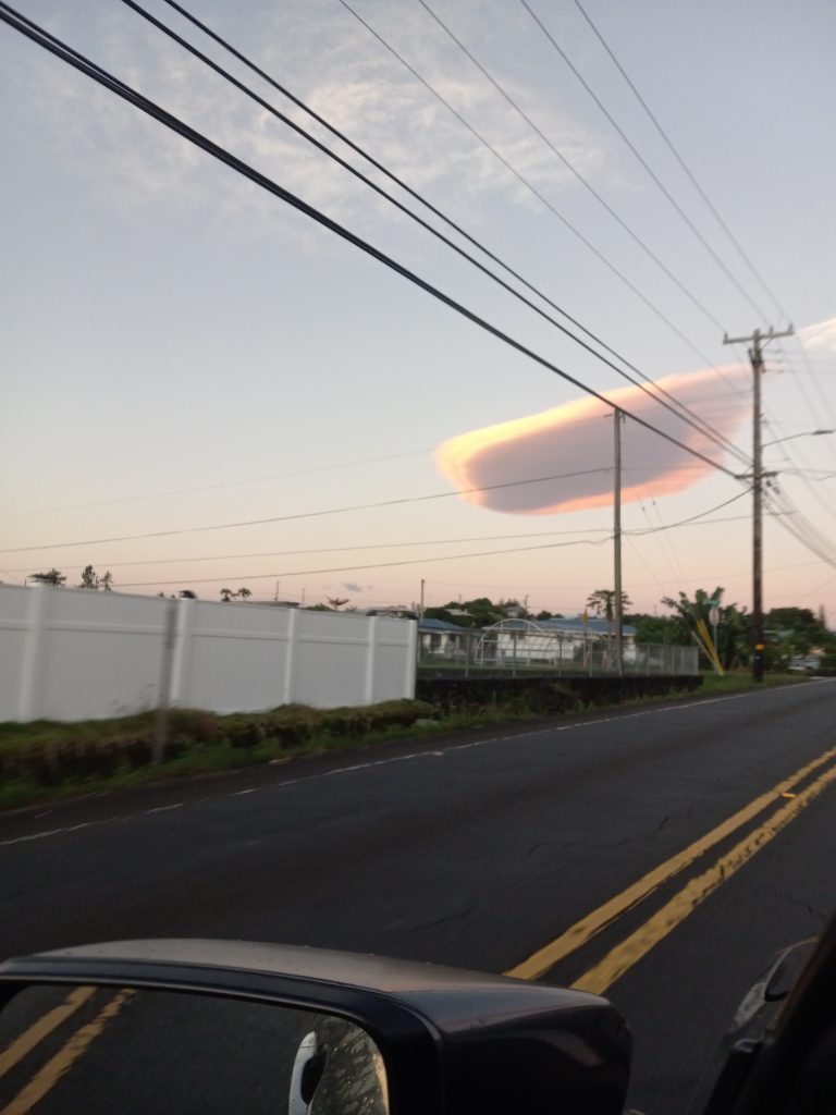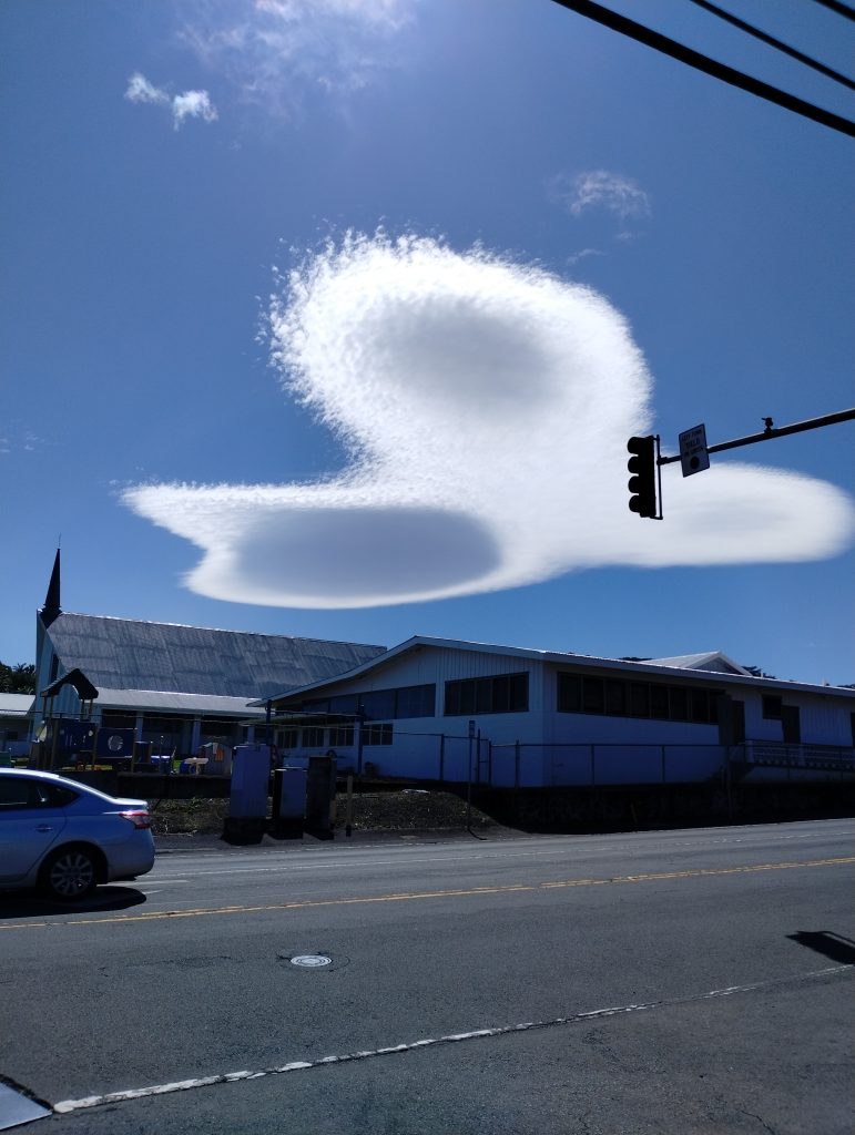 “The winds are pumping this morning!” the Volcano Art Center said in a post sharing a photo of one of the clouds hanging out over its gallery in Hawai‘i Volcanoes National Park. “And this space ship cloud is ready to abduct the Volcano Art Center staff!”