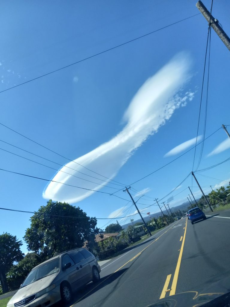 On Wednesday, Hawai’i Island was treated to relatively rare, lower-atmospheric spectacles for skies over Hawai‘i — lenticular clouds. The thick, lens-shaped, bright white, fluffy masses hovered high in the otherwise clear blue sky for most of the day.
