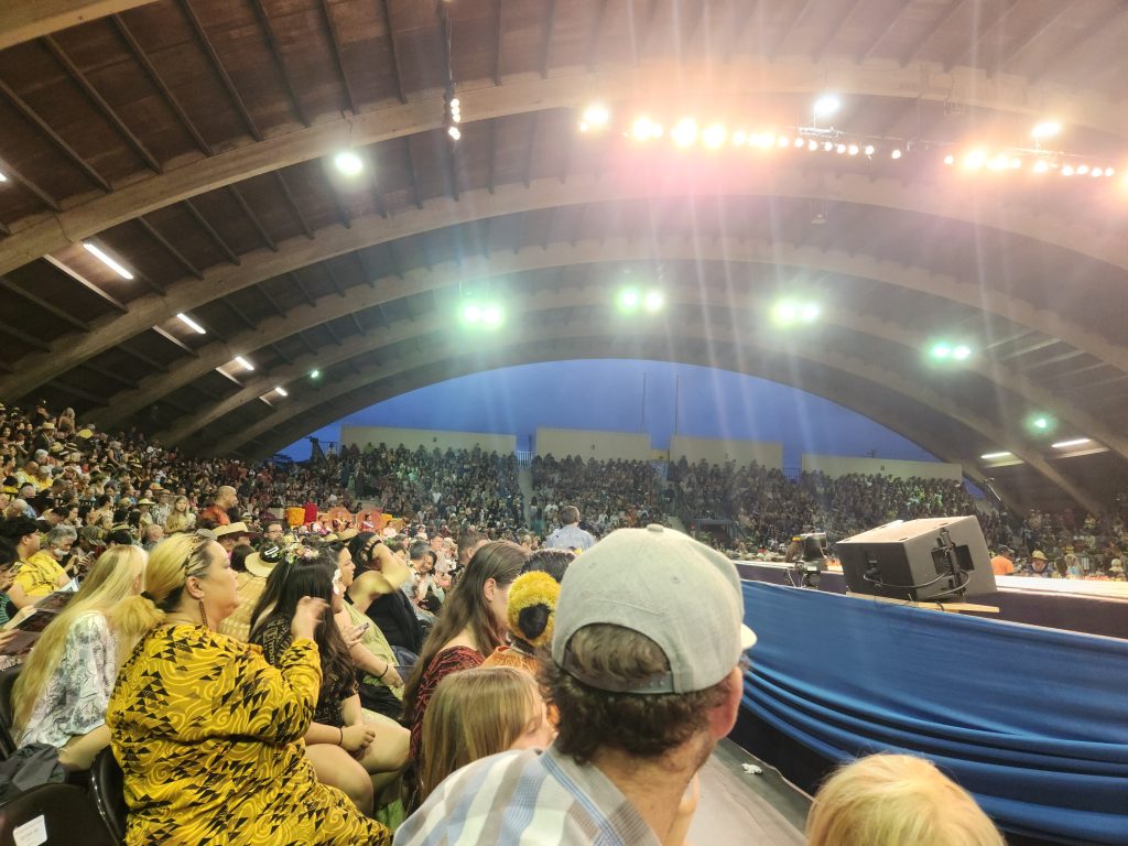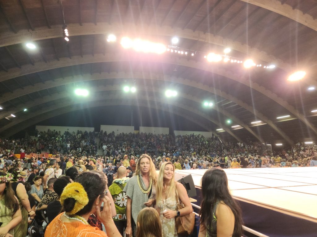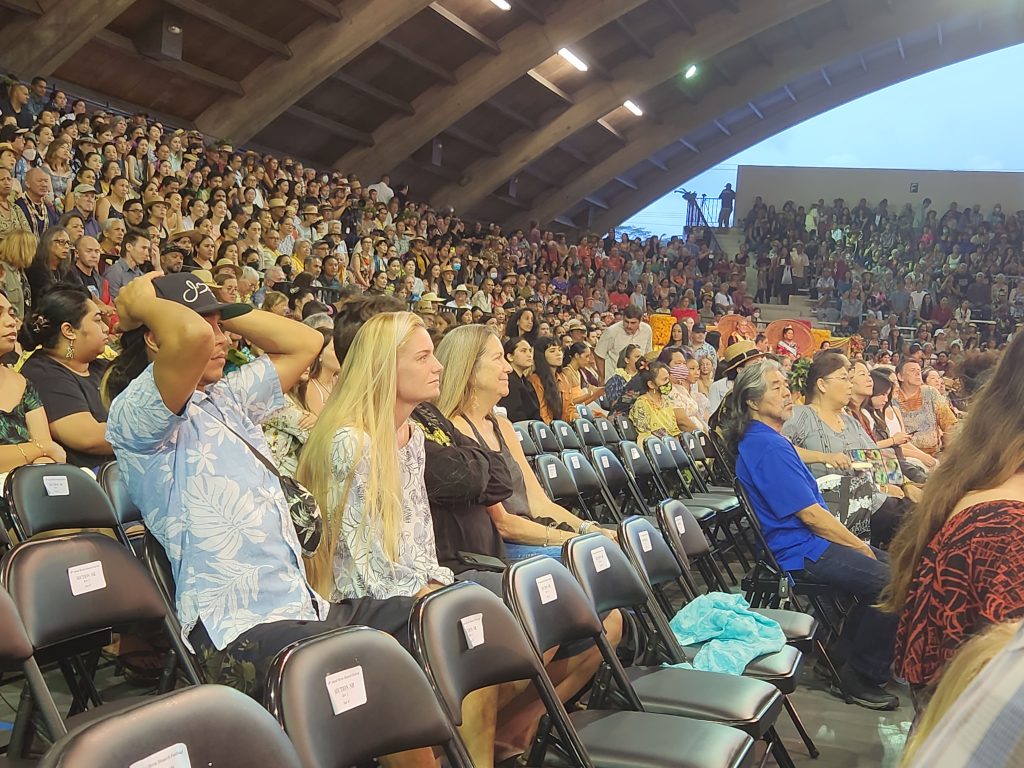 The line to get in formed hours early and snaked around to the back of the stadium, from the front entrance to the Butler Building and Afook-Chinen Civic Auditorium. The venue was teeming, inside and out, with people as the crowd of 4,000-plus volunteers, dancers, kumu and spectators prepared for the spectacle.