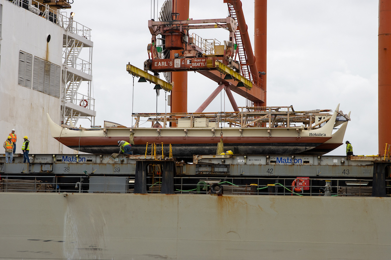 Voyaging canoe Hōkūleʻa arrived in Tacoma, Washington Friday on the R.J. Pfeiffer, a Matson container ship. The canoe was received by a crew from the Polynesian Voyaging Society and then towed from the Matson shipyard to the Maritime Museum at Foss Waterway Seaport.