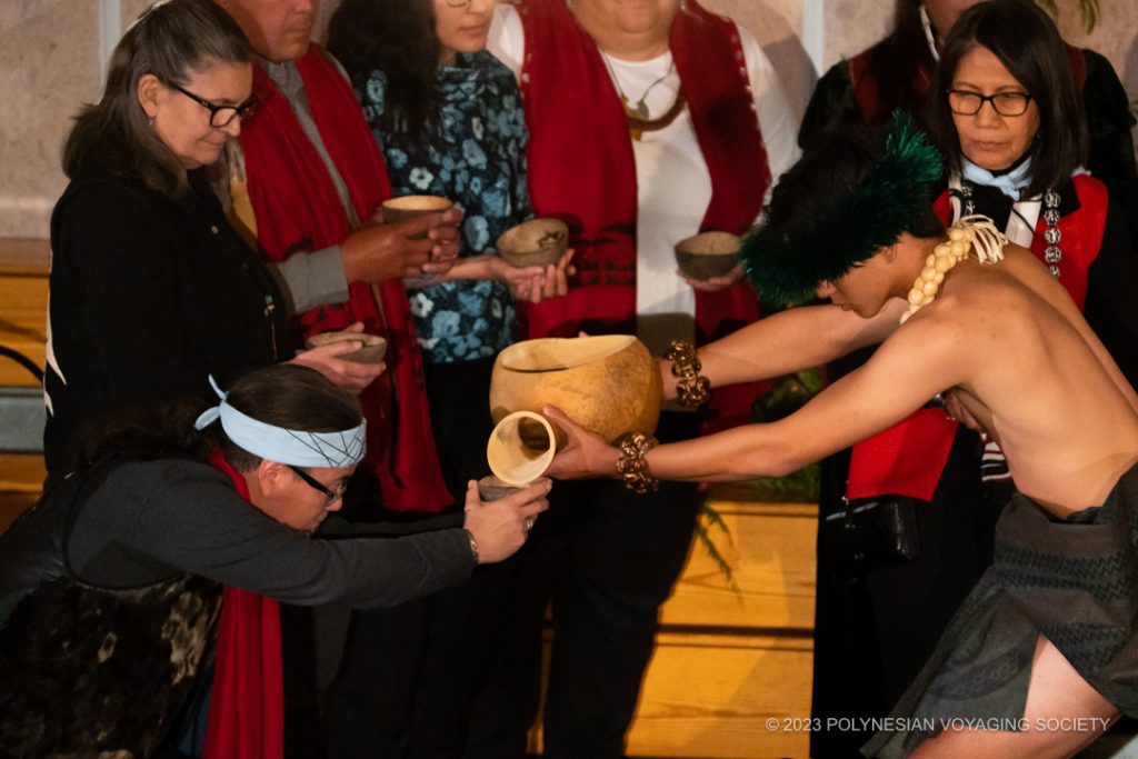 ʻAwa was also symbolically served to the society’s guiding elders who have passed on. Alaska Natives, voyaging leadership, and others formed a circle and drank ʻAwa together to affirm their commitment to unity and the voyage.