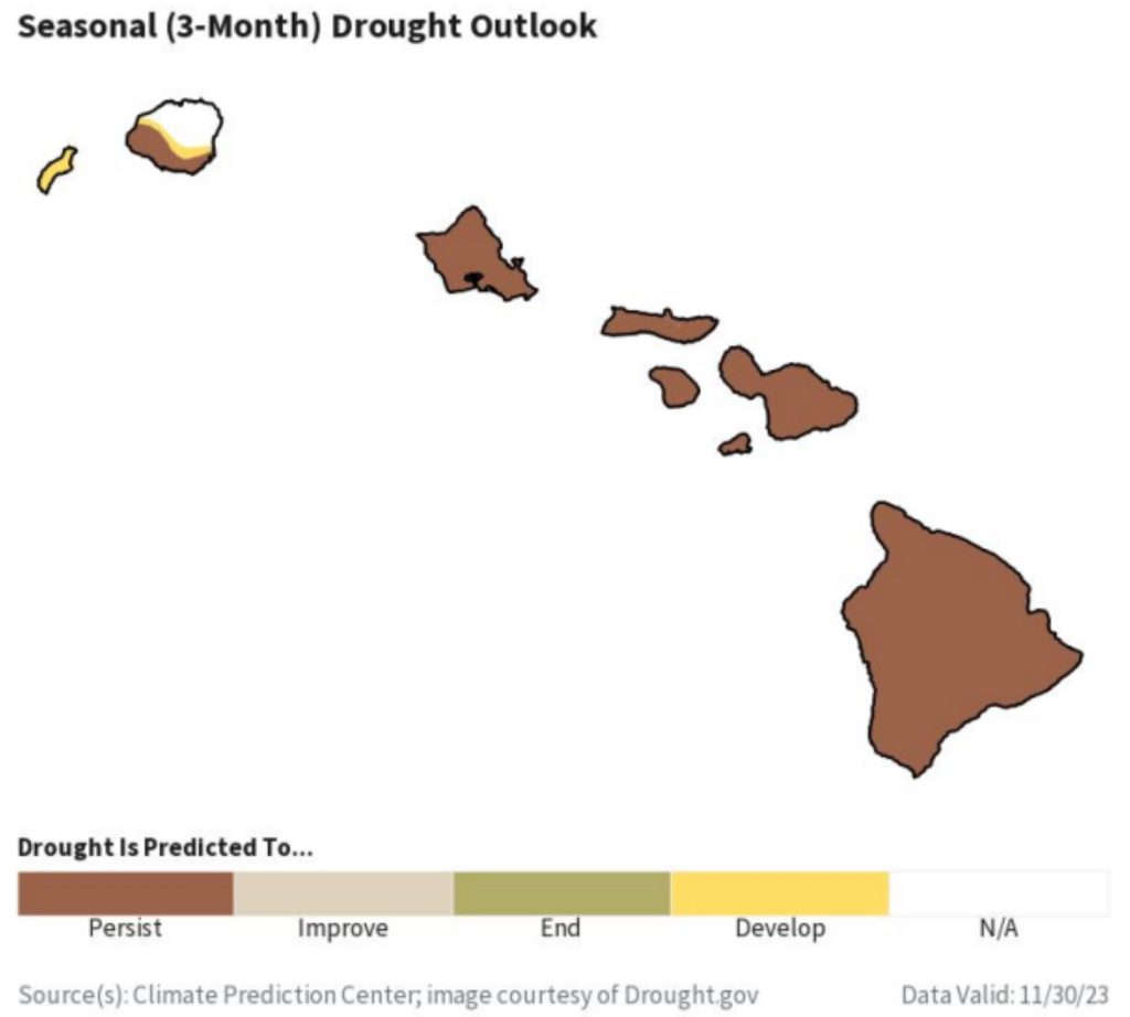 In the longer term, according to a Dec. 8 drought information statement from the National Weather Service in Honolulu, the 3-month outlook shows the ongoing El Niño likely causing below normal precipitation across the state well into 2024. Peak dryness is expected from mid-December through February.