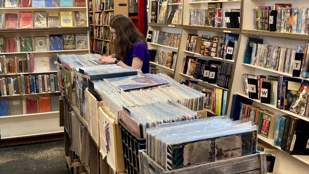 “We have a lot more new books, we have a lot more vinyl records, we have a lot more video games, we have a lot more comic books. We also have a much more organized and diversified selection of books of all types,” he said. “We’ve also expanded into art merchandise and things that my wife makes, like the Mochi-Celeste stickers, which are one of our hottest items.”