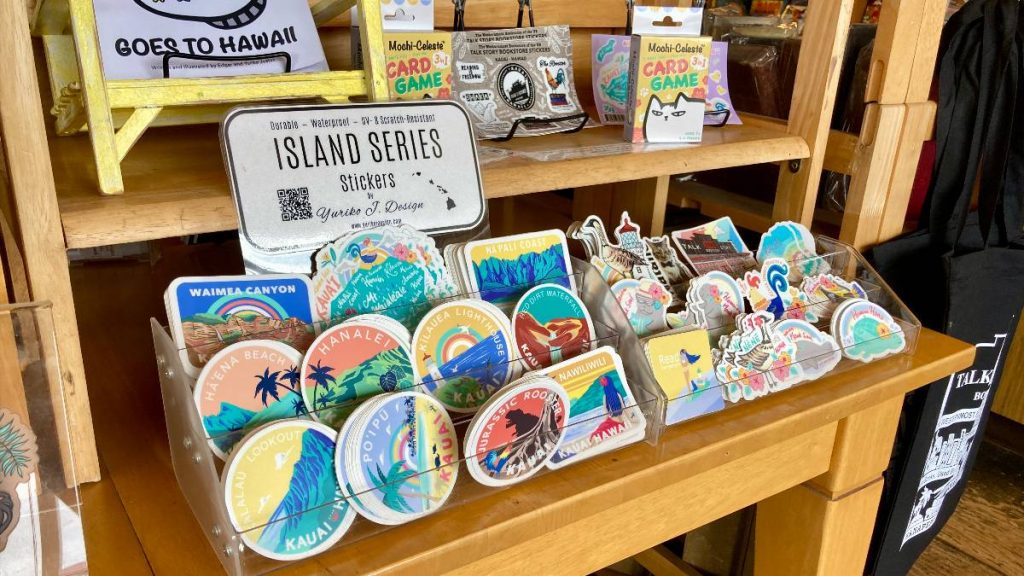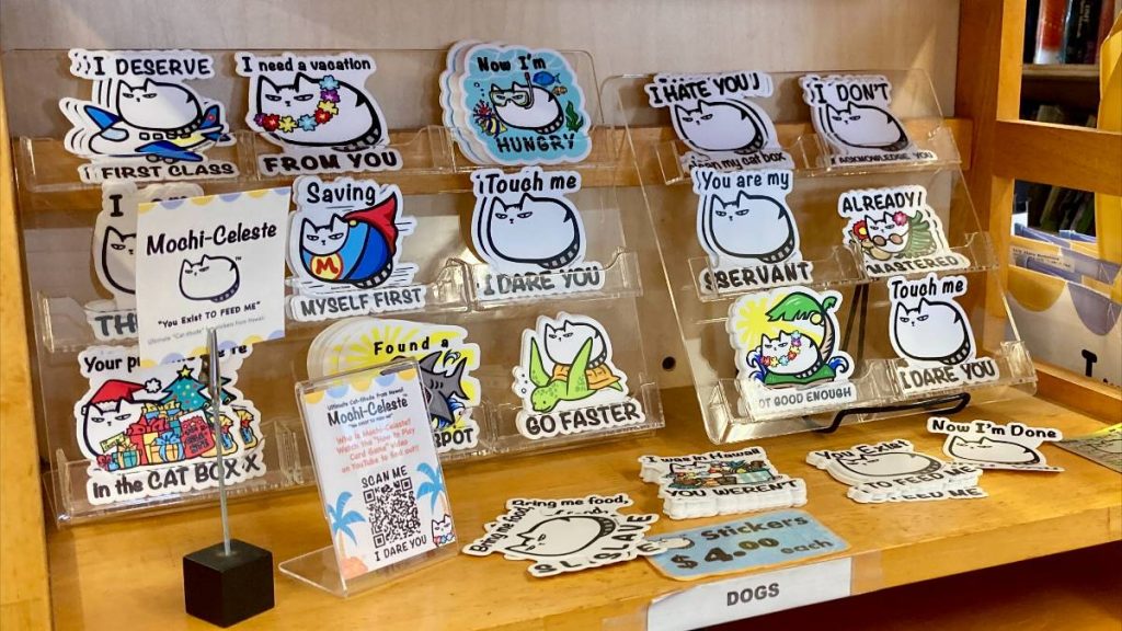 Yuriko has since produced a wide variety of artwork for sale throughout the Hawaiian Islands – including tote bags, postcards, prints, picture books and the aforementioned stickers, which are inspired by Talk Story’s first “Cat Boss,” Celeste.