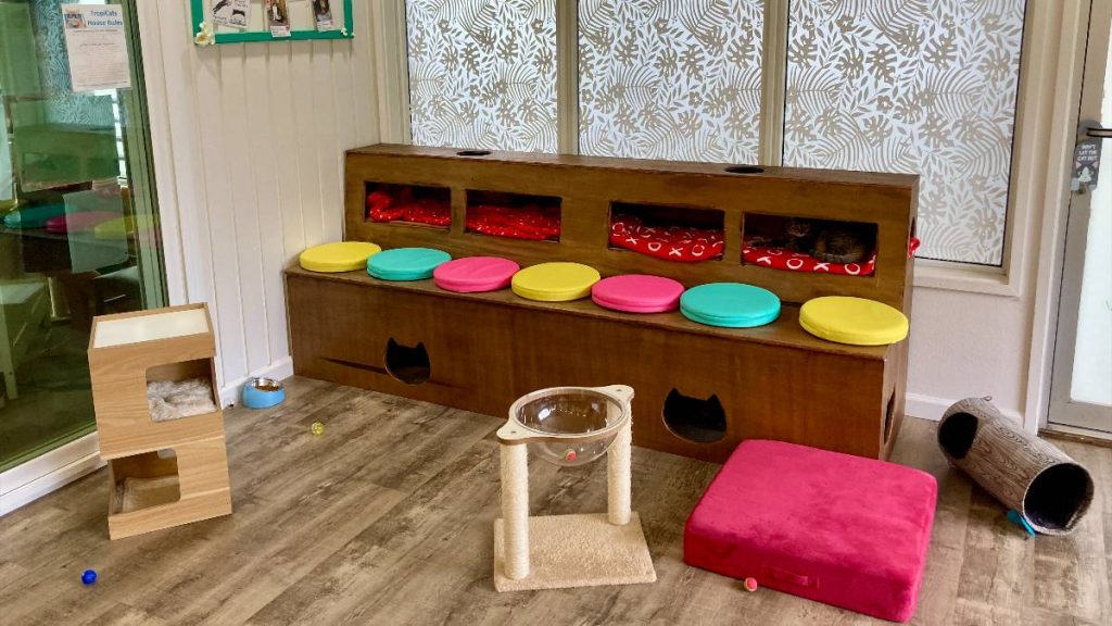 “We had a lot of fun shopping,” laughed Ramseth, gesturing at the vibrant decorations placed throughout the café’s nearly 300-square-foot cat room, which can house up to 10 four-legged friends at any given time. Highlights include an “ALOHA” mural punctuated by wall-mounted cat lounges; a “tree” topped by enormous faux leaves; and a cozy bench filled with cat-sized hideaways.
