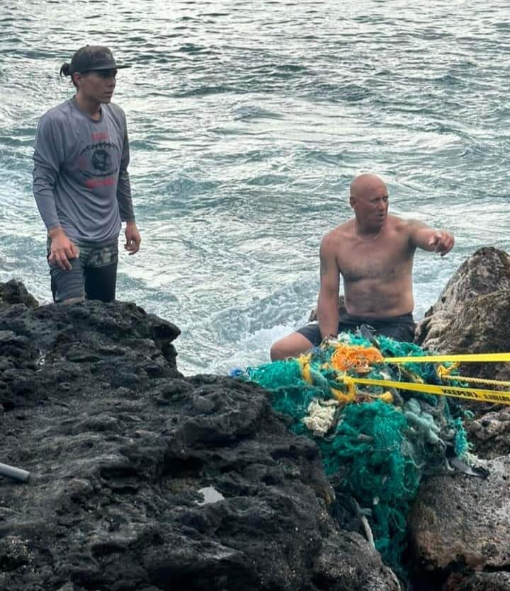 Volunteers started working on getting the nets out of the area on Feb. 14. Lynn Bowen, volunteer with Surfrider said they used steak knives and sawzaws to cut it up as it was hooked around a giant boulder snagged on sharp lava.