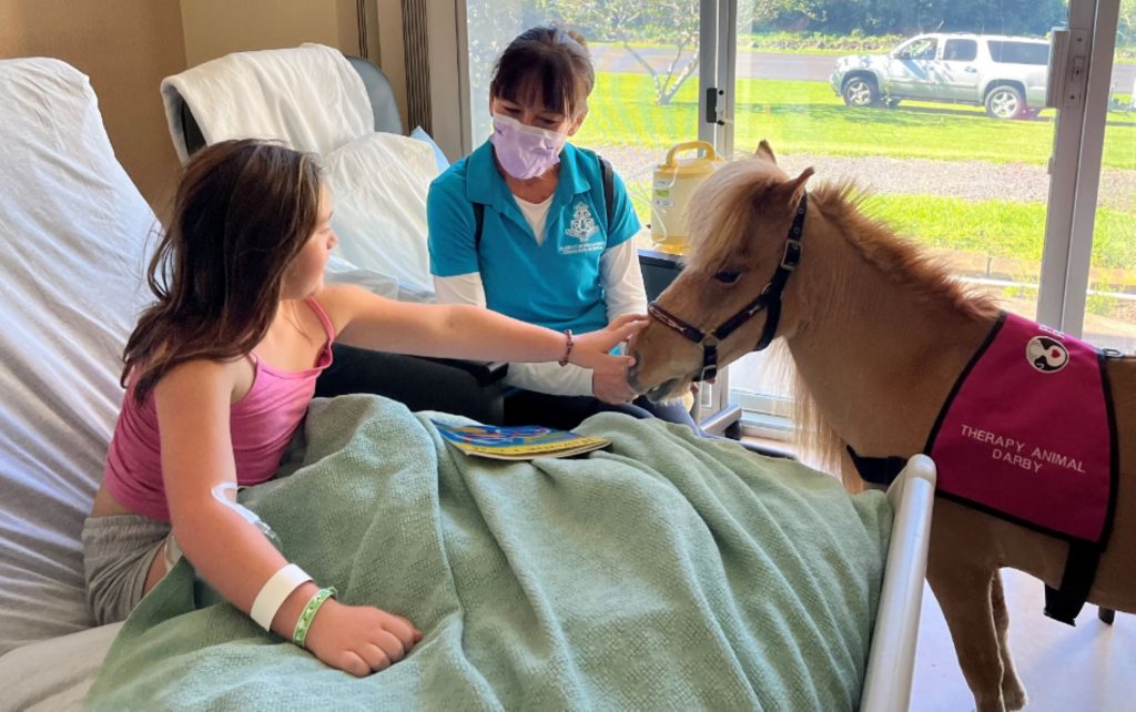 “I am extra excited because I am the first nomination from the state of Hawai‘i!” Darby, speaking through the Scullys, says on his Pet of the Year profile page. “I’m also the only Pet Partners miniature horse in Hawai‘i visiting patients, but I’d like to change that. … I’d like to have more of my animal friends helping out, raising the spirits of people in need, and this is where you can help!”