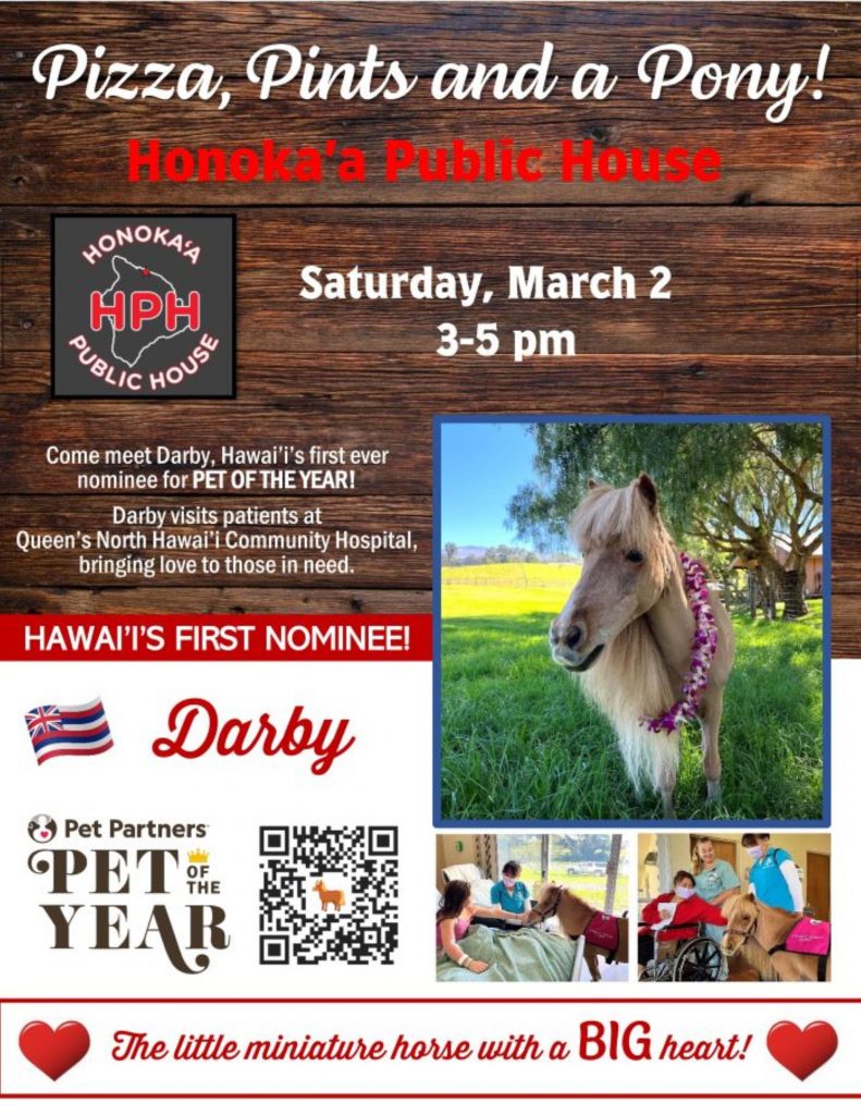 You can meet Darby in person and help him win the Pet of the Year crown during a special fundraising event at Honoka‘a Public House, which, coincidentally, is owned by a couple who share their last name with the Waimea mini horse, Michelle and Keith Darby, who Scully knows personally.
