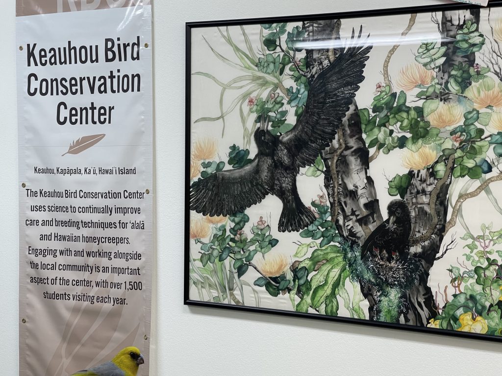 She and the cameras then moved into the library which features the second part of the mural. It’s dedicated to the native Hawaiian crow (ʻAlalā), which viewers will see in real life, once the shades are raised. In addition to ecological education, the virtual field trip also addresses the importance of forest birds and culture.