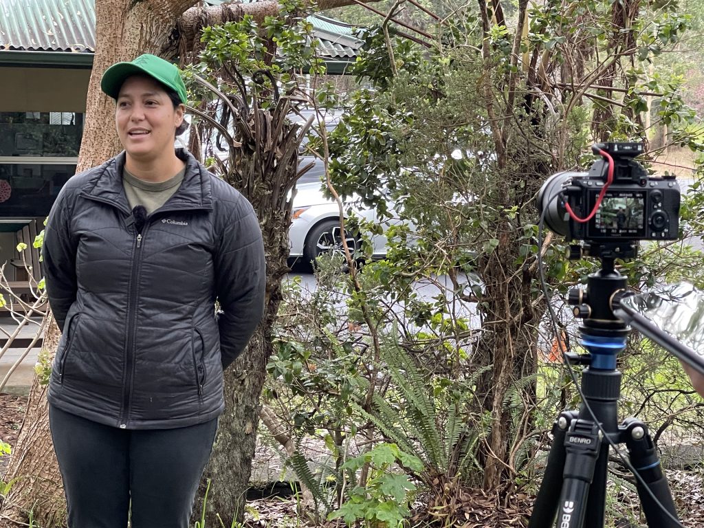 In late February, armed with a collection of cameras and technology, Atwood worked with the ‘host’ of the conservation center virtual field trip, wildlife care supervisor Lisa Mason. First standing outside the facility, Atwood records Mason as she delivers her introduction. “On your field trip today, you’ll get to see our facility and some of the birds who call this center their home. ʻAlalā, Palila, ʻAkikiki, ʻAkekeʻe, and Kiwikiu,” she says into the camera.