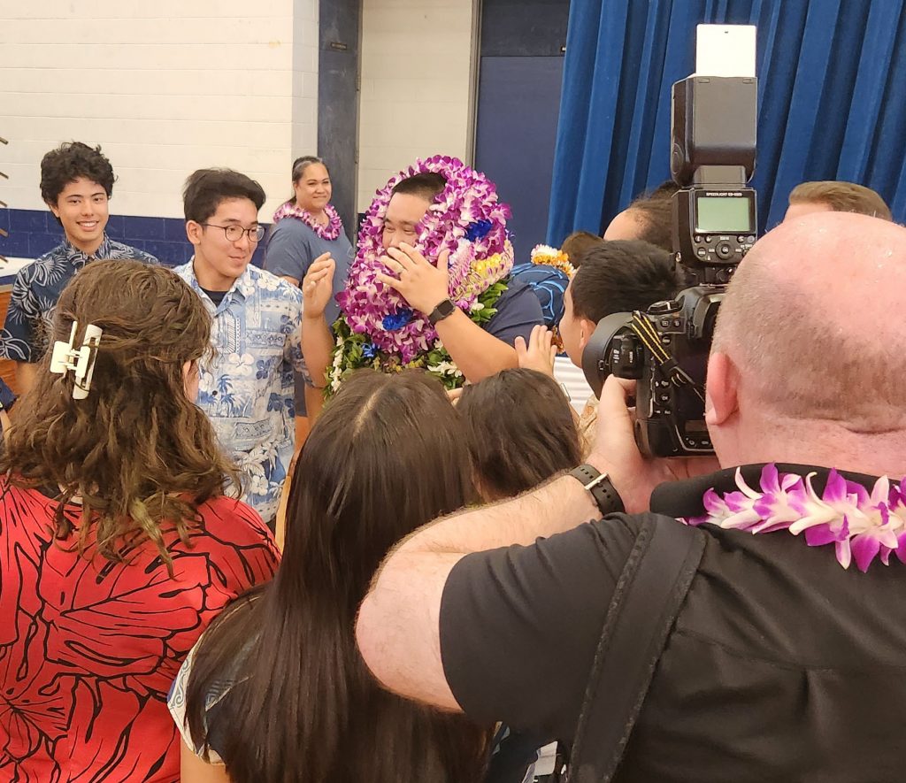 Inouye’s neck was so full of lei by the time he headed back to class Tuesday morning that at one point you could barely see his head. He and Milken called his parents on his cellphone after the assembly to give them the good news.