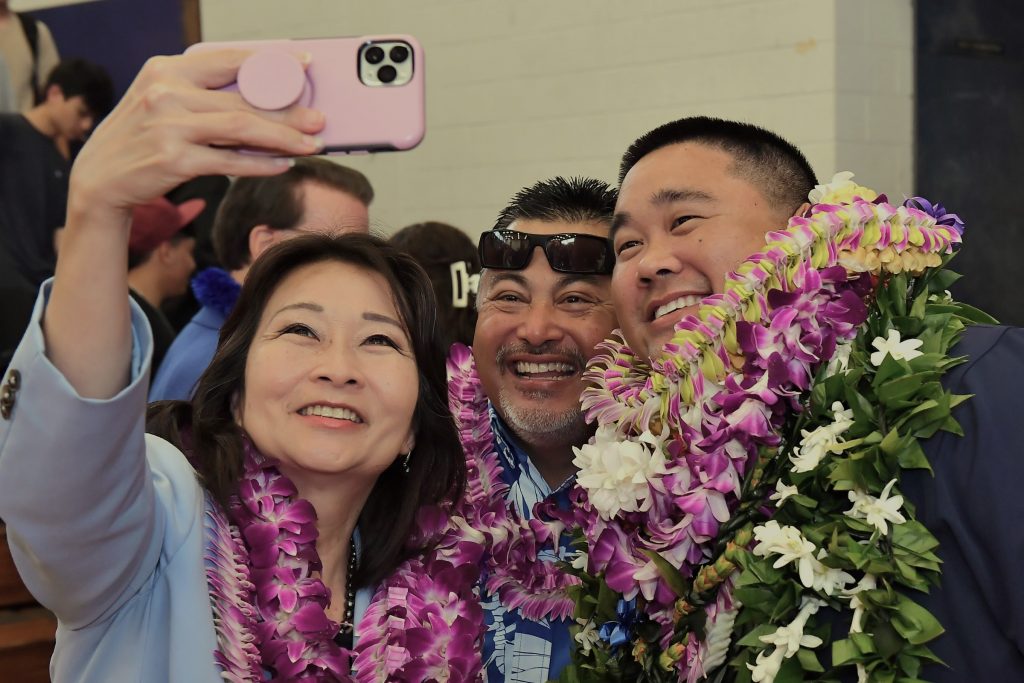 • Milken Educator Award recipient and Waiākea High School math teacher Rory Inouye (right) takes a selfie with Hawai‘i Lt. Gov. Sylvia Luke and Waiākea High School Principal Kelcy Koga following Tuesday’s assembly. (Photo courtesy of the Milken Family Foundation/Milken Educator Awards)