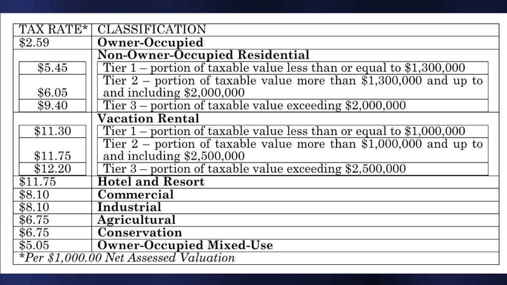Under the new tiered system, rates for non-owner occupied residential properties, as well as all vacation rentals, hotels, and resorts, will be subject to increased rates. The owner-occupied rate will remain unchanged.