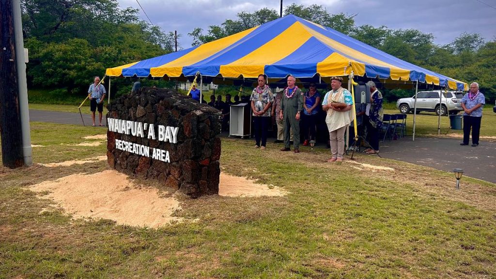 The US Navy’s Pacific Missile Range Facility in Kekaha formally changed a recreation area at its military base to its Native Hawaiian place name during a sign unveiling ceremony on Friday, May 31, as Major’s Bay officially became Waiapua‘a Bay.