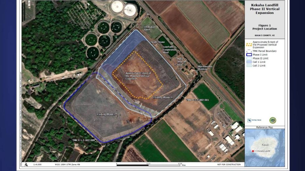 Fraley shared that the current landfill, known as Phase 2, is expected to reach maximum capacity in June 2027, at a height of 120 feet above sea level. As a temporary solution, the county is currently working on the Kekaha Landfill Expansion Project to vertically expand the landfill’s capacity by 50 feet, up to 170 feet.