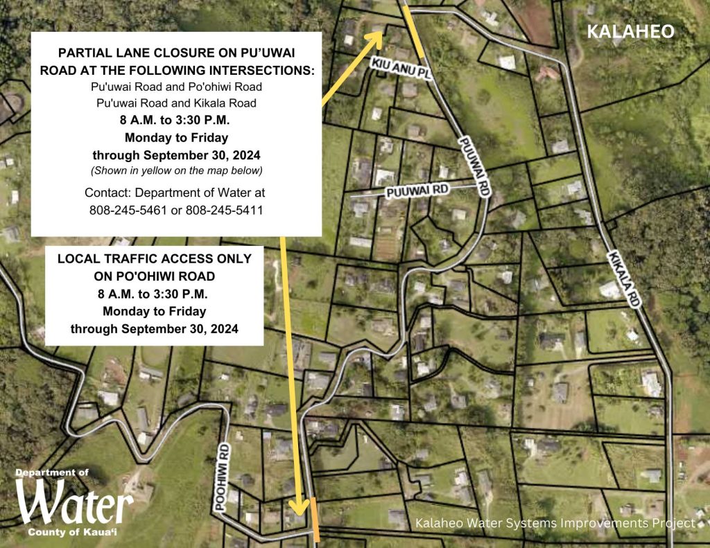 The intermittent lane and road closure notices on Pu’uwai Road and Po’ohiwi Road for the Kalāheo Water Systems Improvements Project has been extended through Sept. 30, weather permitting.