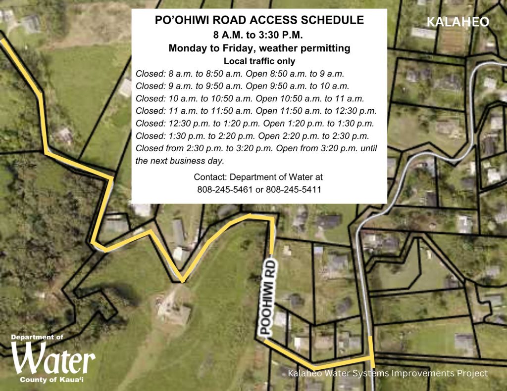 - Local traffic only on Po’ohiwi Road – Due to the narrow roadway, access will be granted to local traffic only on Po’ohiwi Road during the hours of 8 a.m. to 3:30 p.m., Monday to Friday. Additionally, the following road work schedule is currently in place for Po’ohiwi Road and will continue until work is completed.