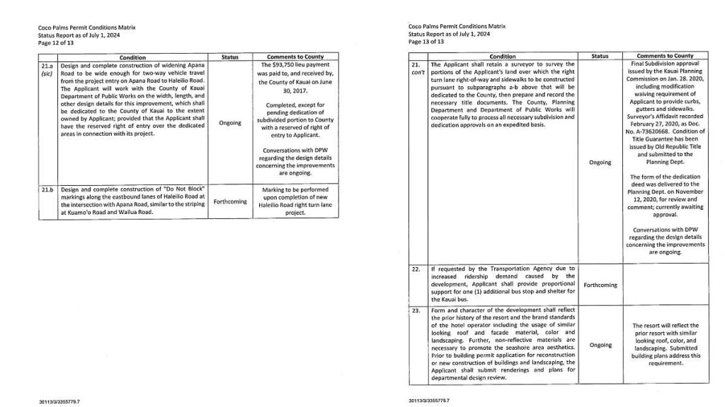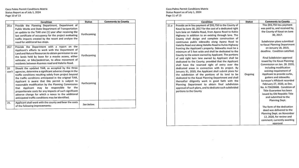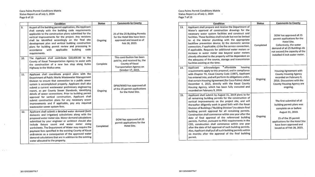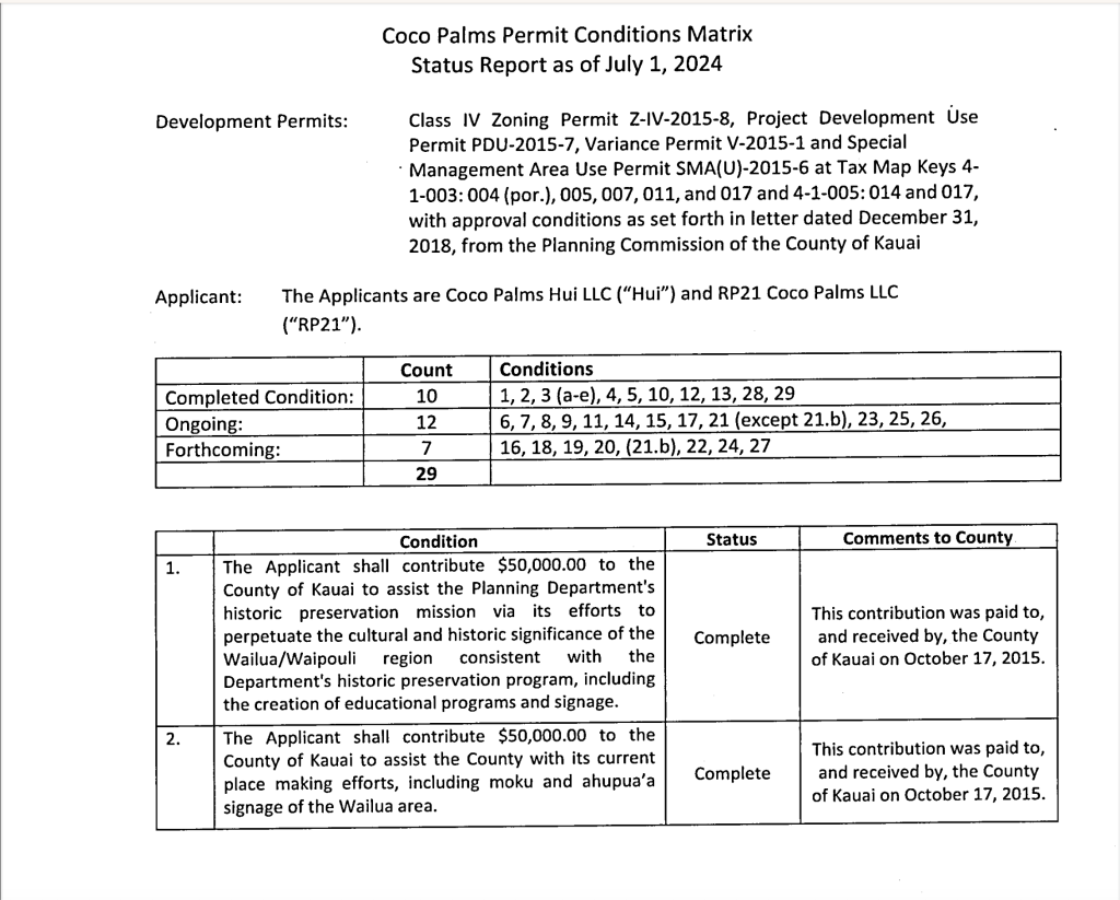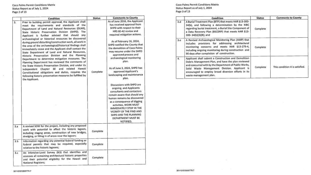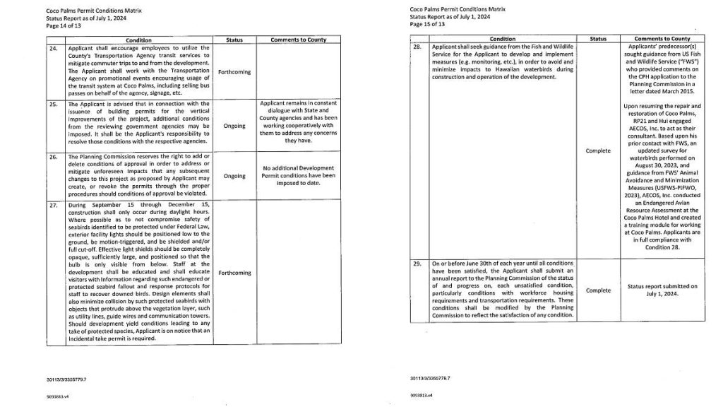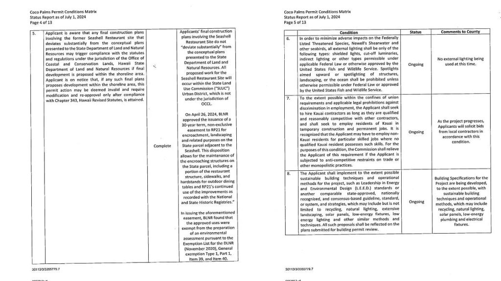On Tuesday, the commission reviewed the mandatory status report — submitted on July 1 by Mauna Kea Trask, an attorney for developer Reef Capital Partners — that detailed that 10 conditions were completed, with 12 marked as ongoing and seven as forthcoming.