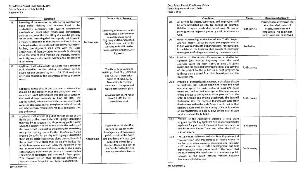 The forthcoming and ongoing conditions include connecting to a public sewer system, a plan to reconstruct the resort’s former Seashell Restaurant by the beach across the street, working with the county on workforce housing, creating public parking spaces, conducting a traffic impact analysis report one year after construction, and shuttle services transporting people to and from the Lihuʻe airport and the Seashell Restaurant.