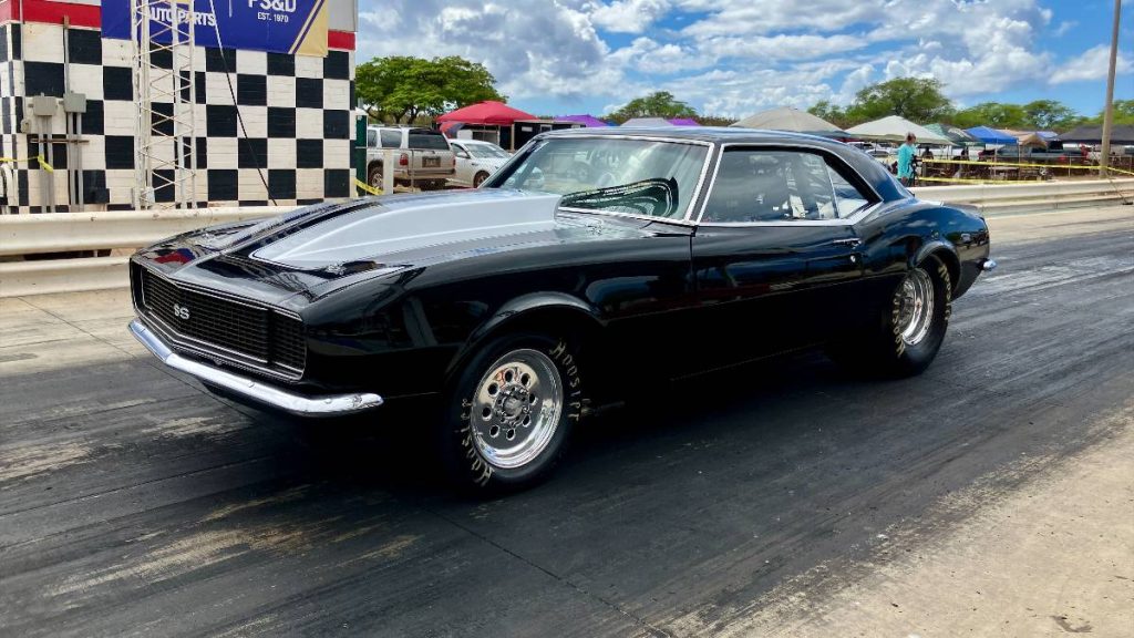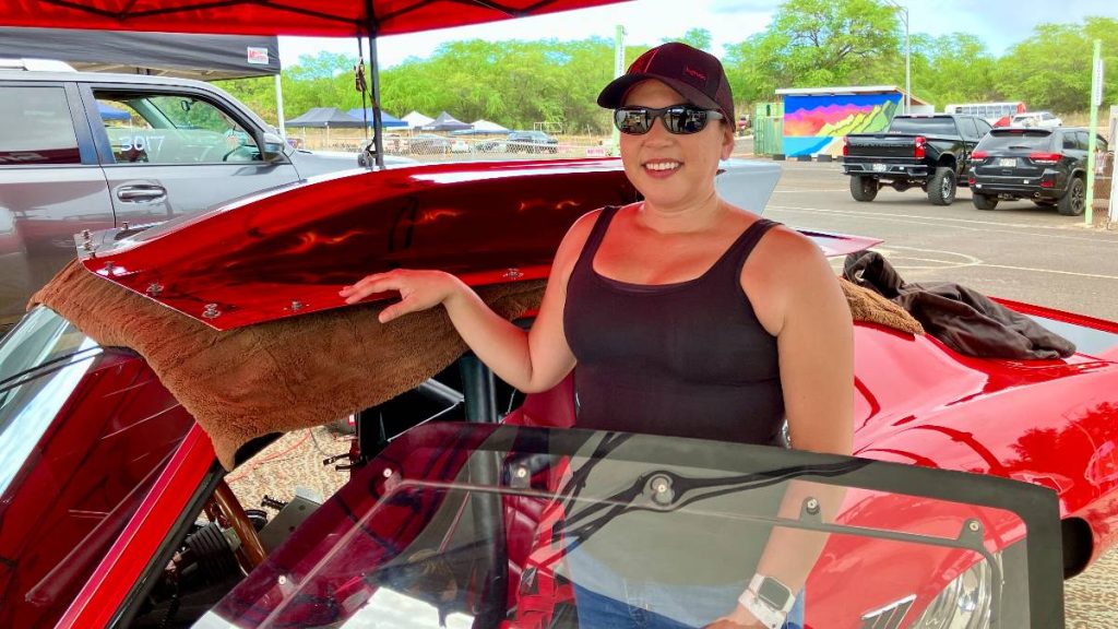 Kealoha now reaches 129 miles per hour in her 1969 Chevrolet Camaro, which boasts a ZZ520 big-block engine beneath its cherry-red hood. Air-brushed flames adorn its door panels; a sticker on its rear windshield reads “Girls Gone Wild.”