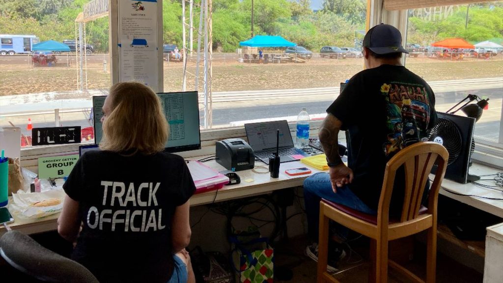 Kaua‘i Raceway Park, although operated by volunteers, runs like a well-oiled machine. Staff members in donated golf carts zip around the track, adjusting sensitive electronic equipment and preparing the starting line with VHT, a synthetic resin that increases traction. A team that includes O‘ahu-based announcer Ryan Pepple calls each race from a tower near the starting line.