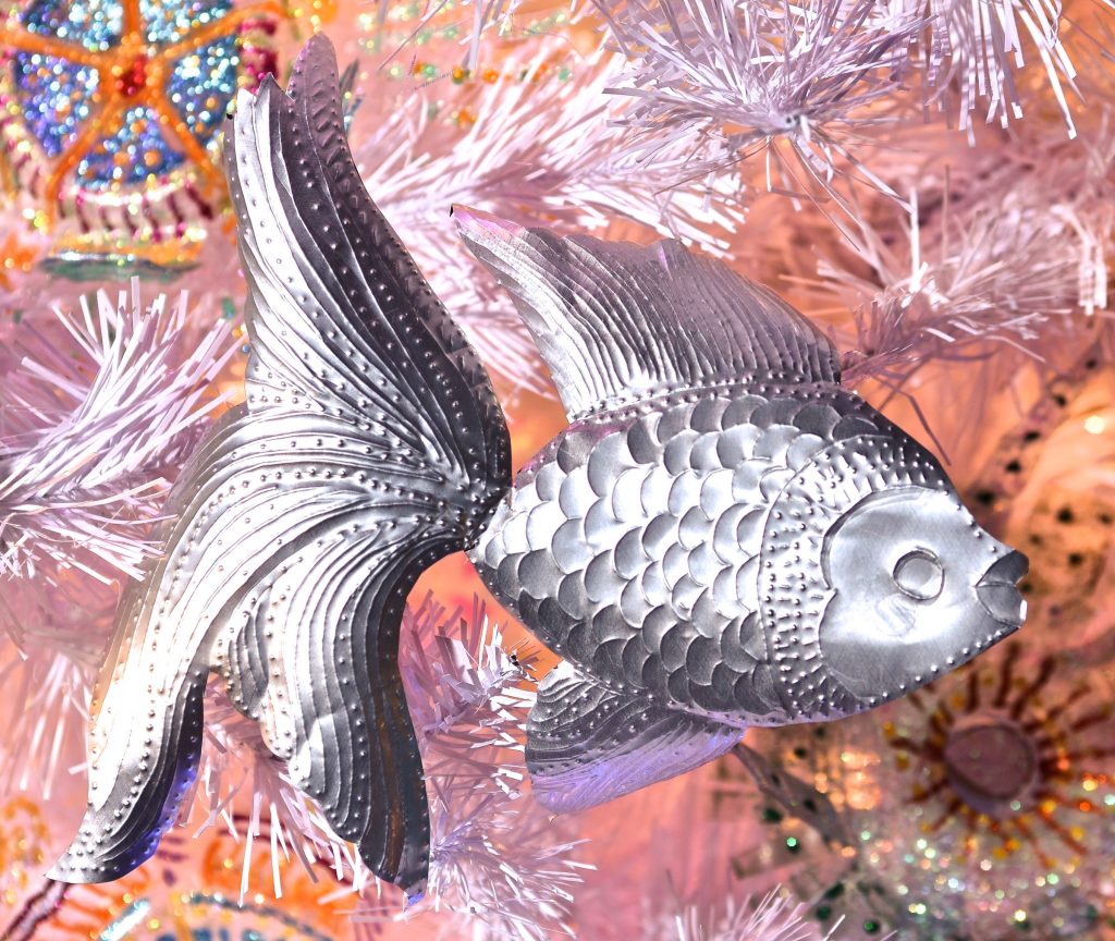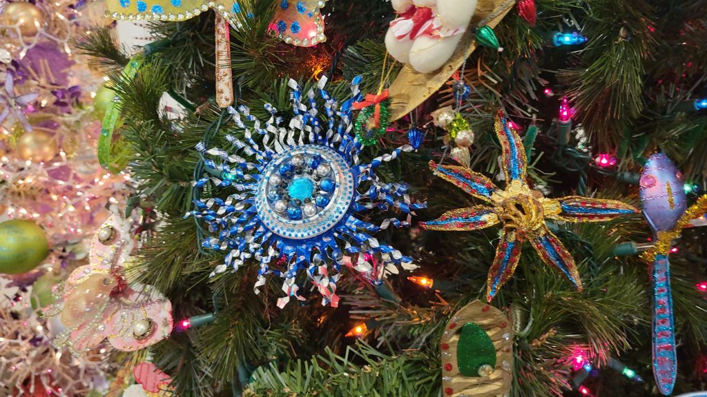 The “If Can, Can Tree features recycled aluminum cans. The “Lure of the Sea” Tree is decorated with embossed recycled aluminum cans and recycled containers.