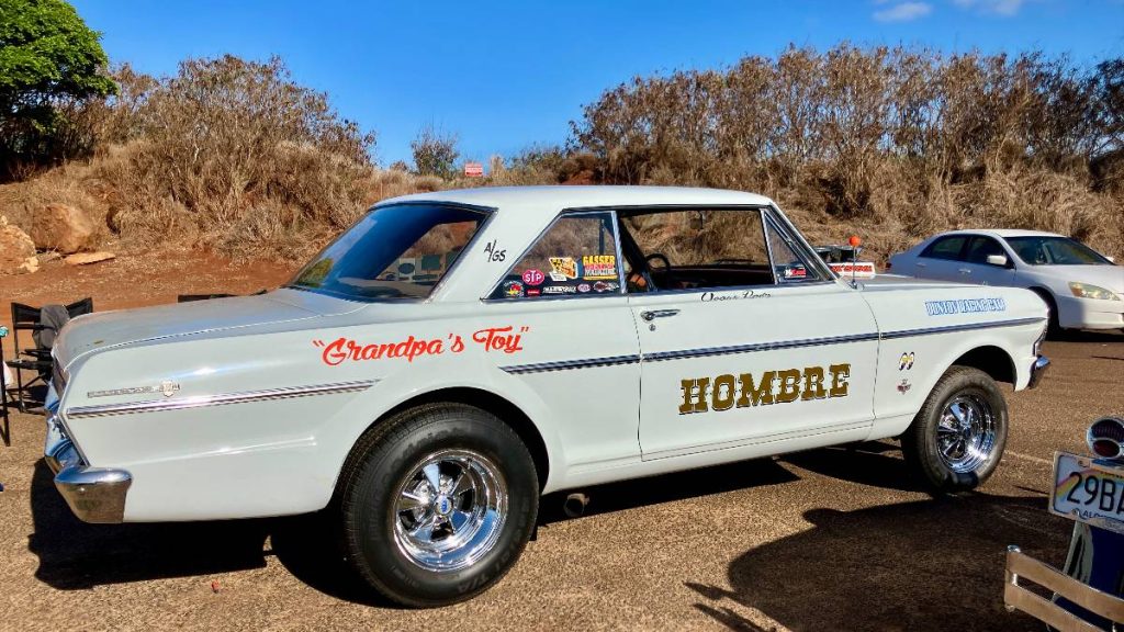 In 1999, Vargas paid $250 to salvage the cream-colored Nova’s rusting and unloved body from a Kaua‘i garage. Today, the vehicle looks like a brand-new “gasser” with a raised front axle to improve weight distribution in drag races.