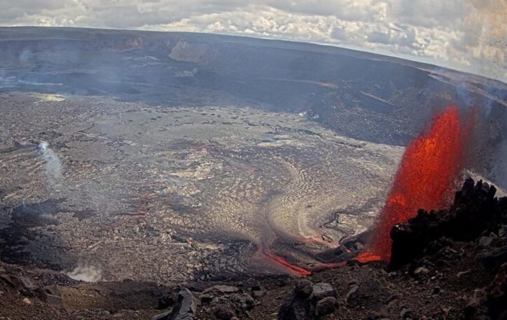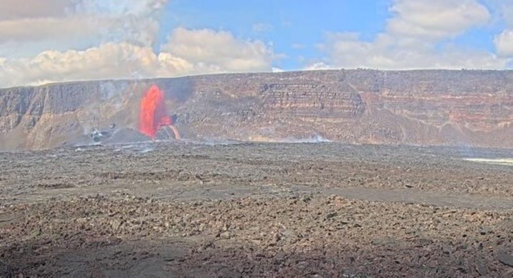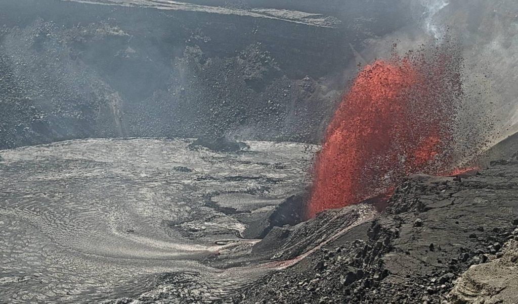 Fountains from the north vent on the southwest side of Kaluapele, the volcano’s summit caldera, were estimated at 10:45 a.m. today to be roughly 330 feet high, with lava covering about a quarter of the Halemaʻumaʻu Crater floor.