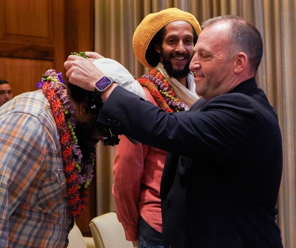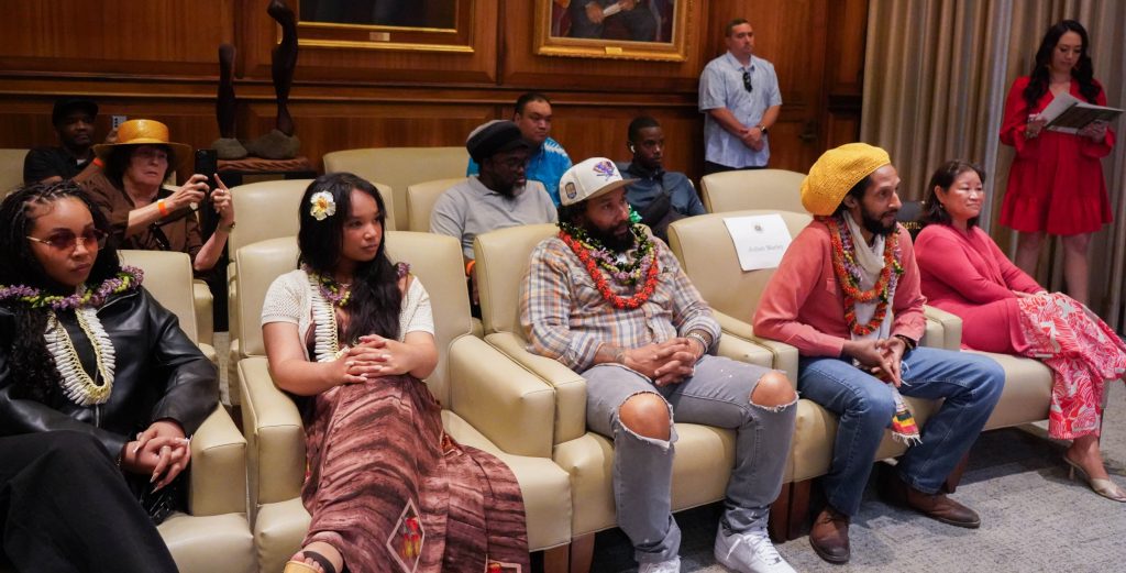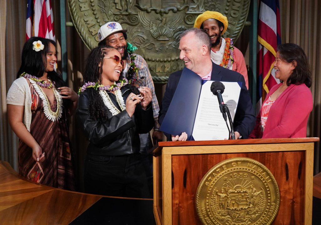 Green signed the proclamation surrounded by Bob Marley’s sons Julian and Ky-Mani along with other members of the Marley ‘ohana in the hope it will encourage all residents and visitors to reflect on the values of love, unity and peace that Marley’s music embodies — and align perfectly with Hawai‘i’s aloha spirit.