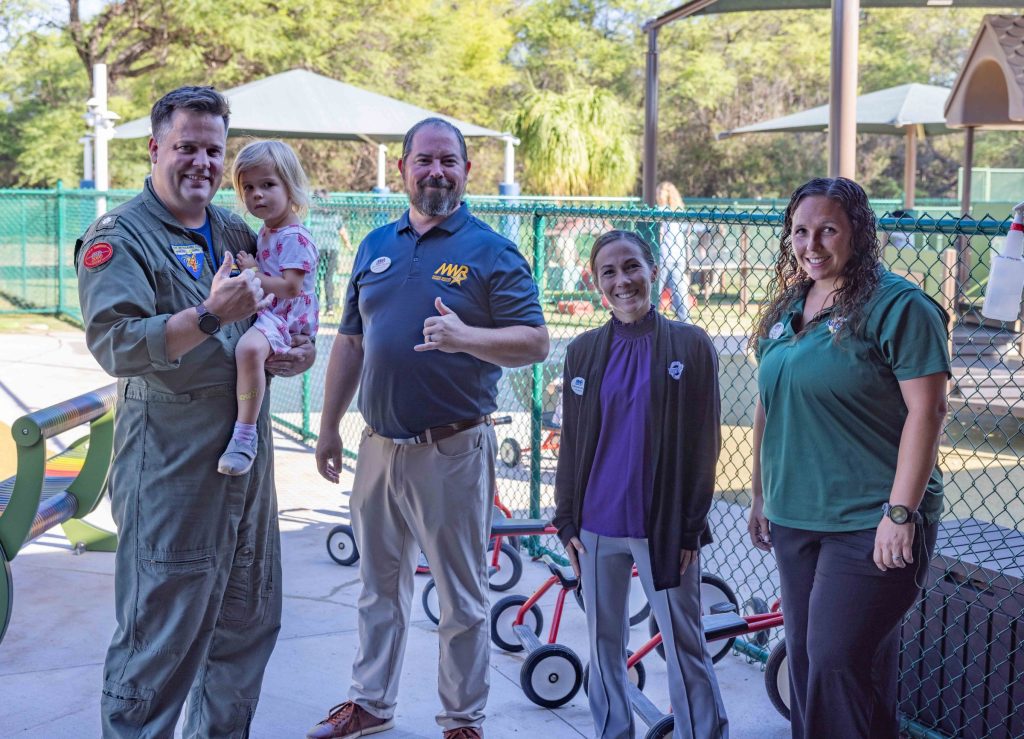 • Pacific Missile Range Facility Air Operations Officer Cmdr. Riley Schoen with his daughter Ruth, alongside Fleet and Family Readiness Director Jeffrey Shaw, Child and Youth Program Director Stephanie Baclig and Lead Sarah Silva during a ribbon-cutting ceremony March 4, 2025, to mark the opening of two new playgrounds at the base’s Child Development Center. (Photo Courtesy: U.S. Navy/Photo by Public Affairs Officer Jonell Kaohelauli’i)