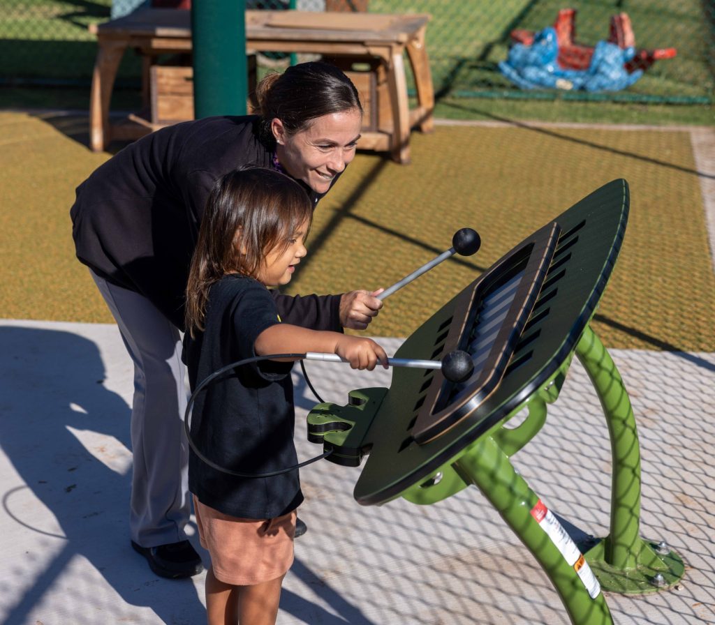 • Pacific Missile Range Facility’s new Child and Youth Program Director Stephanie Baclig accompanies a child on the musical station during the opening of the new playgrounds March 4, 2025, at the base’s Child Development Center. (Photo Courtesy: U.S. Navy/Photo by Public Affairs Officer Jonell Kaohelauli’i)