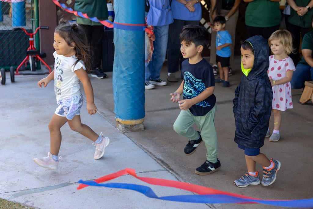 • An excited preschooler runs through the ribbon while another student attempts to go under it to be the first to play on the new playground structures March 4, 2025, during the ribbon-cutting ceremony. (Photo Courtesy: U.S. Navy/Photo by Public Affairs Officer Jonell Kaohelauli’i)