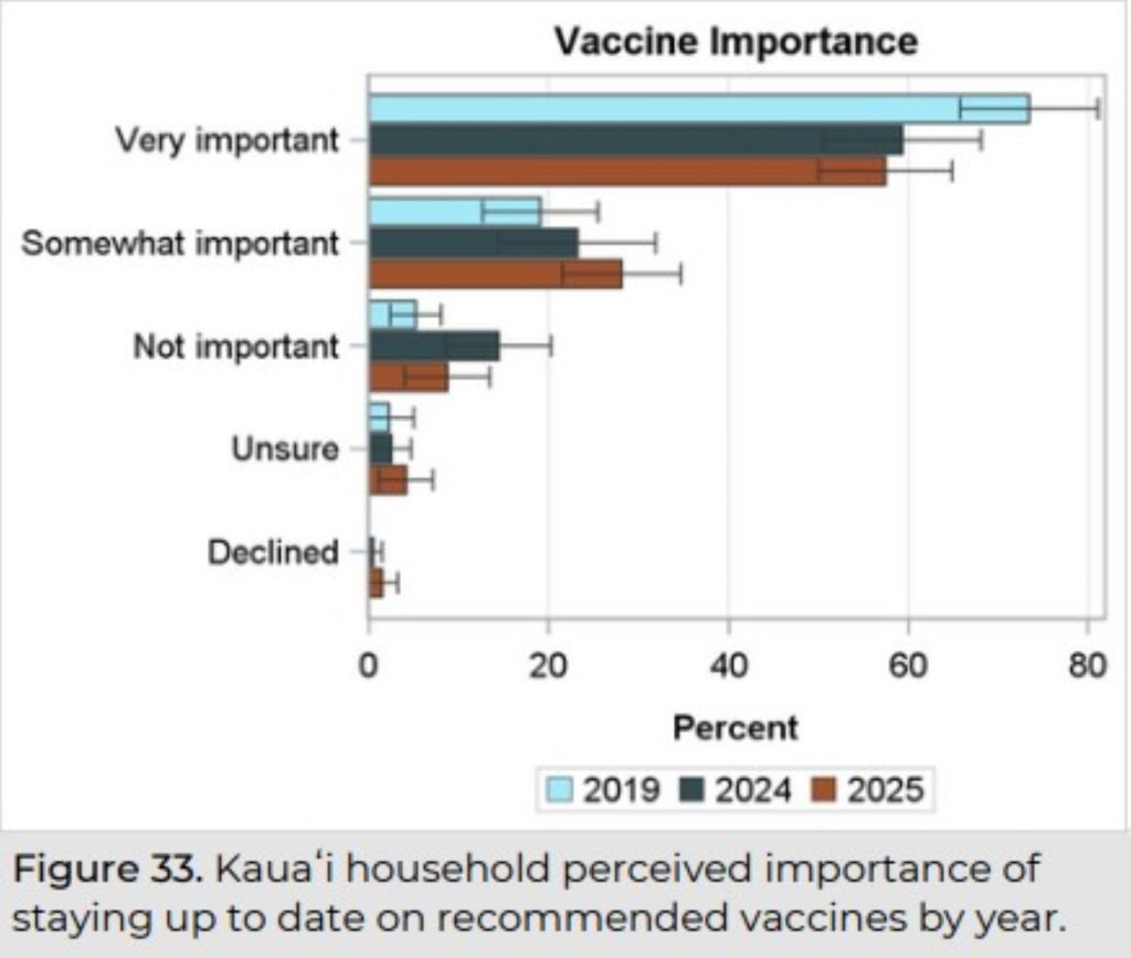 • While the majority of Kauaʻi households (57%) continue to think it is very important to stay up to date on recommended vaccines, a statistically significant 16% decline was observed from 2019 to 2025.