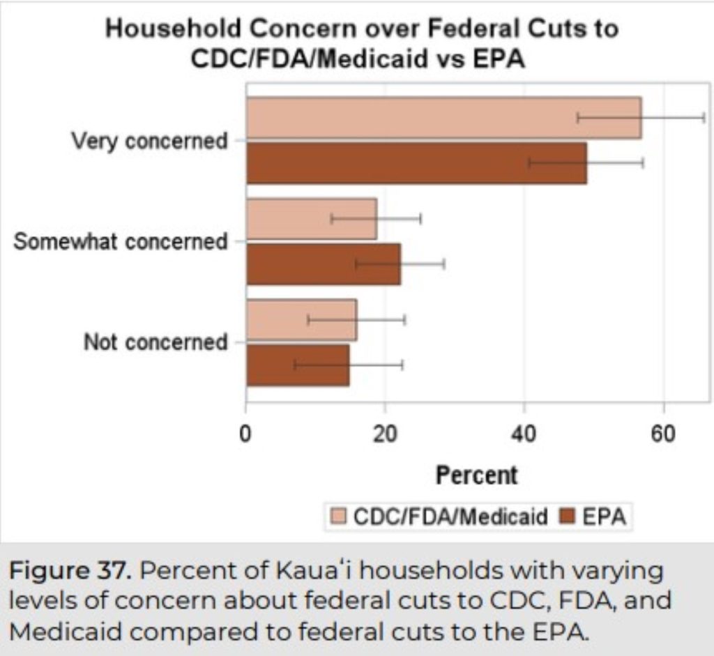 • Similarly, most Kauaʻi households (76%) are very or somewhat concerned about federal cuts to Centers for Disease Control and Prevention, U.S. Food and Drug Administration and Medicaid.