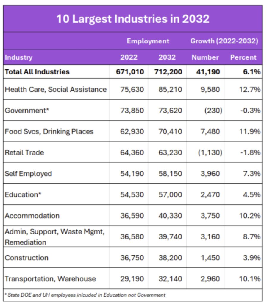 Hawai‘i’s total employment is projected to grow by 6.1% during the next decade, increasing from 671,010 jobs in 2022 to 712,200 by 2032 — an addition of 41,190 jobs.