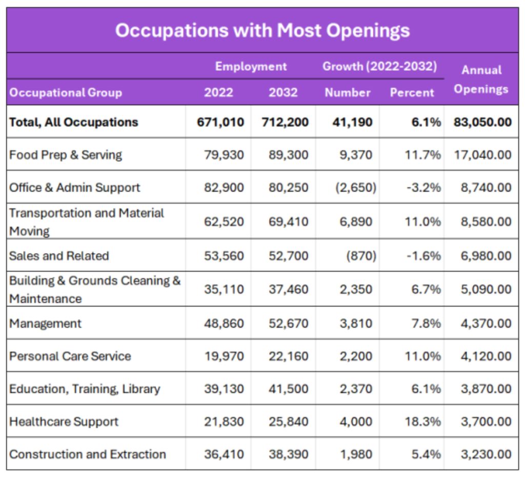 - In contrast, government and retail trade employment are projected to decline, influenced by federal policies and continuing shift toward e-commerce.