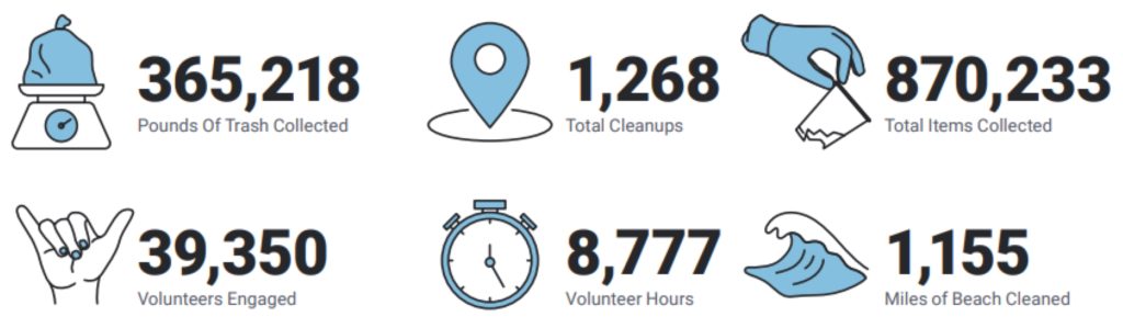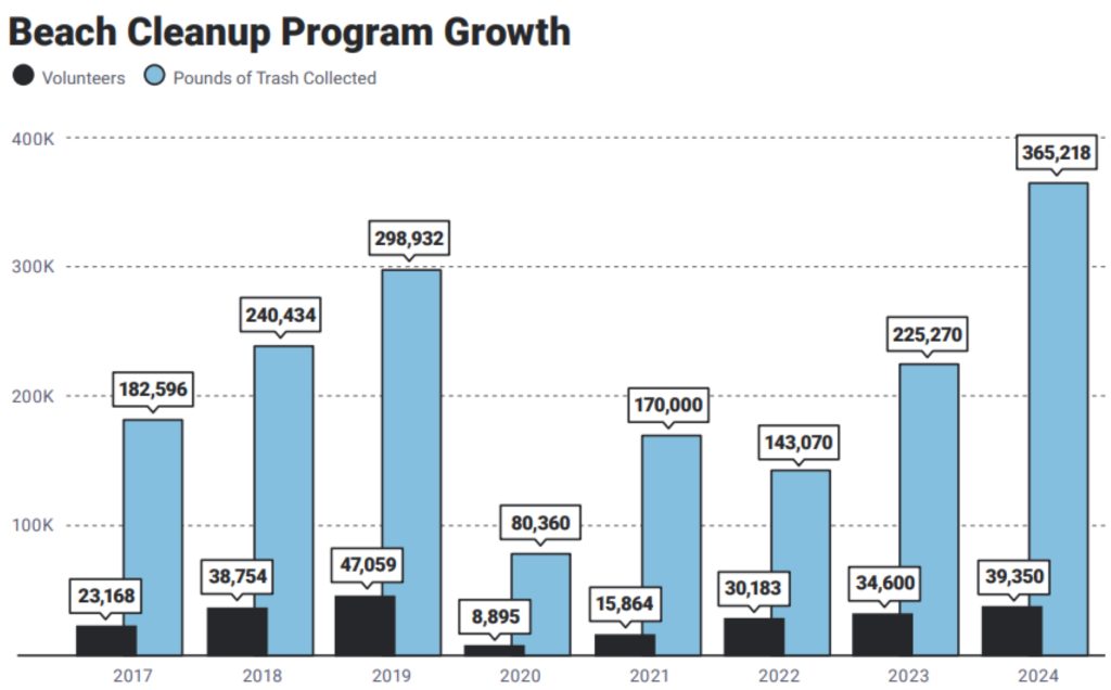 Surfrider Foundation recorded the largest amount of trash ever removed from beaches throughout the nation during cleanups, totaling a record 365,218 pounds of trash — nearly 183 tons — during 2024.