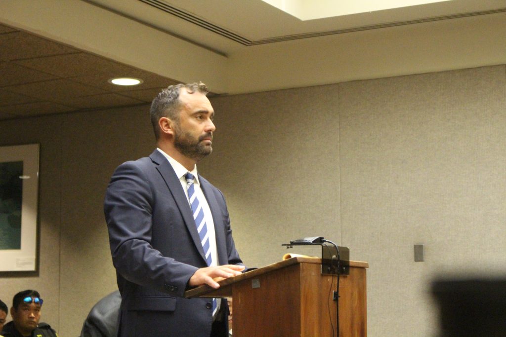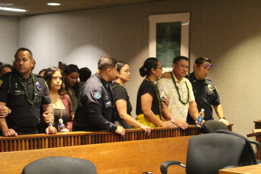 The hearing was moved to a larger courtroom to accommodate the family of the victim and the large number of officers present, including Maui Police Chief John Pelletier who was seated in the front row of the gallery. Earlier this week, he vowed the department would be “relentless in its pursuit of justice” for the fallen officer.