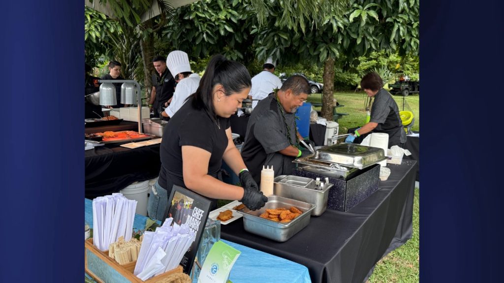 Top Iron Chefs, such as 2025 Poke Fest Winner Chef Mark Oyama of Kaua‘i Shrimp, who guided his student cooks with a unique dish: Crispy Tilapia Katsu, served with Kaua‘i Shrimp Mabo and tofu sauce. The main course featured Ornellas ‘Ohana’s hunted venison, accompanied by pickled Waipā wasabi fern and Hanalei heart of palm.