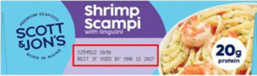 This recall applies only to the select Scott & Jon’s Shrimp Scampi with Linguini products identified as follows: